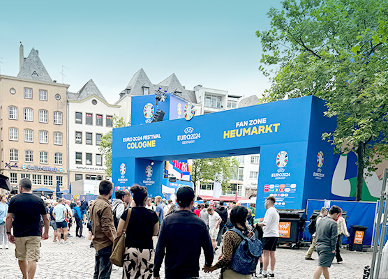 Public Viewing auf drei Bildschirmen und ein gastronomisches Angebot bilden den Kern der 3.700 Quadratmeter großen Fan Zone im Herzen der Kölner Altstadt. Doch damit nicht genug: Während der EM legen immer wieder wechselnde DJs den passenden Fan-Party-Sound auf.